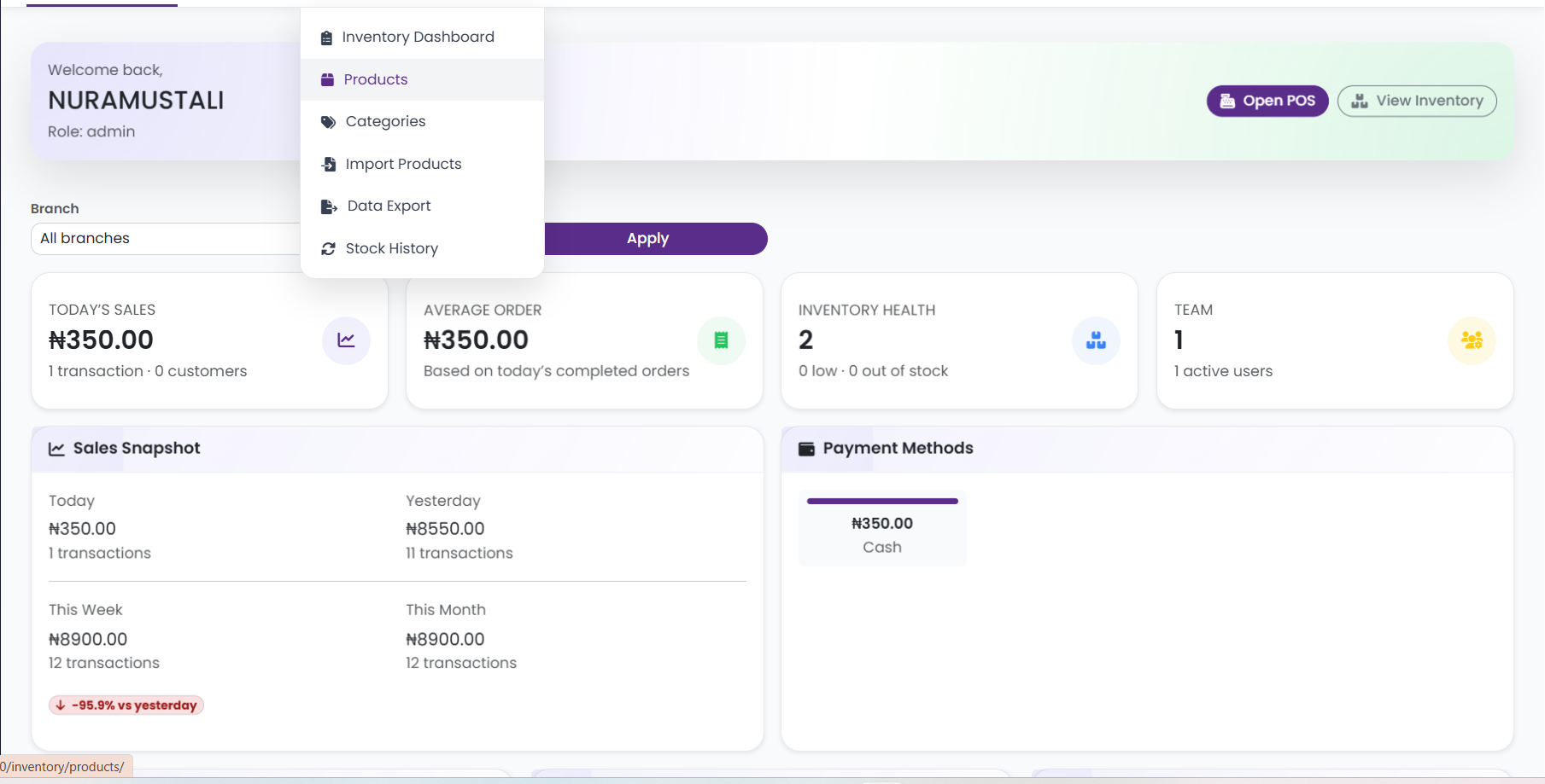 - Standard — ₦6,000/month: For growing businesses. Adds barcode POS, bulk product import, full P&L reports, audit logs, and data export.